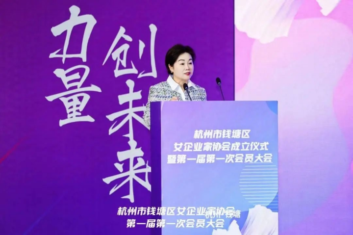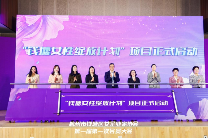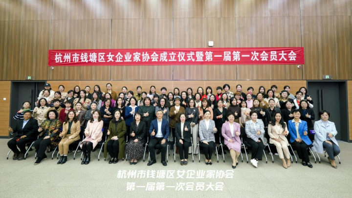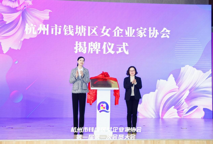 市妇联党组成员、副主席叶琦与杭州市钱塘区副区长潘伟红为杭州市钱塘区女企业家协会揭牌。协会商标整体外形呈现为一个大写的“Q”,取自钱塘、企业家和Queen的首字母,中间的四个圆形花瓣代表女企业家们聚集在一起,合力创办女企业家协会,表达协会的无限潜能。