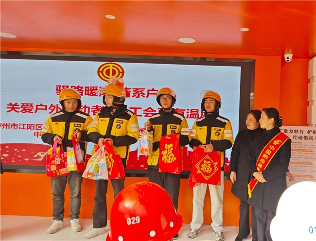 “工会服务户外劳动者日”当天,邮储银行江阳区支行邮爱驿站与江阳区华阳街道康乐社区酒城乐园“红立方”工会驿站携手开展“驿路暖阳·情暖户外”主题活动,用实际行动为户外劳动者们送上寒冬里的暖意与新春祝福。